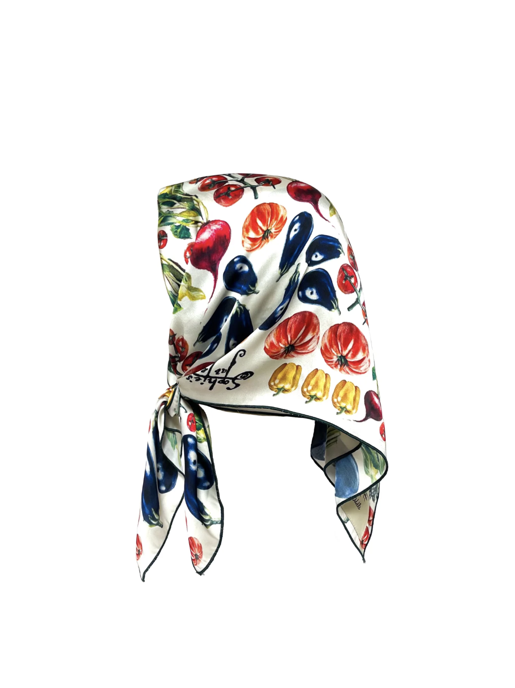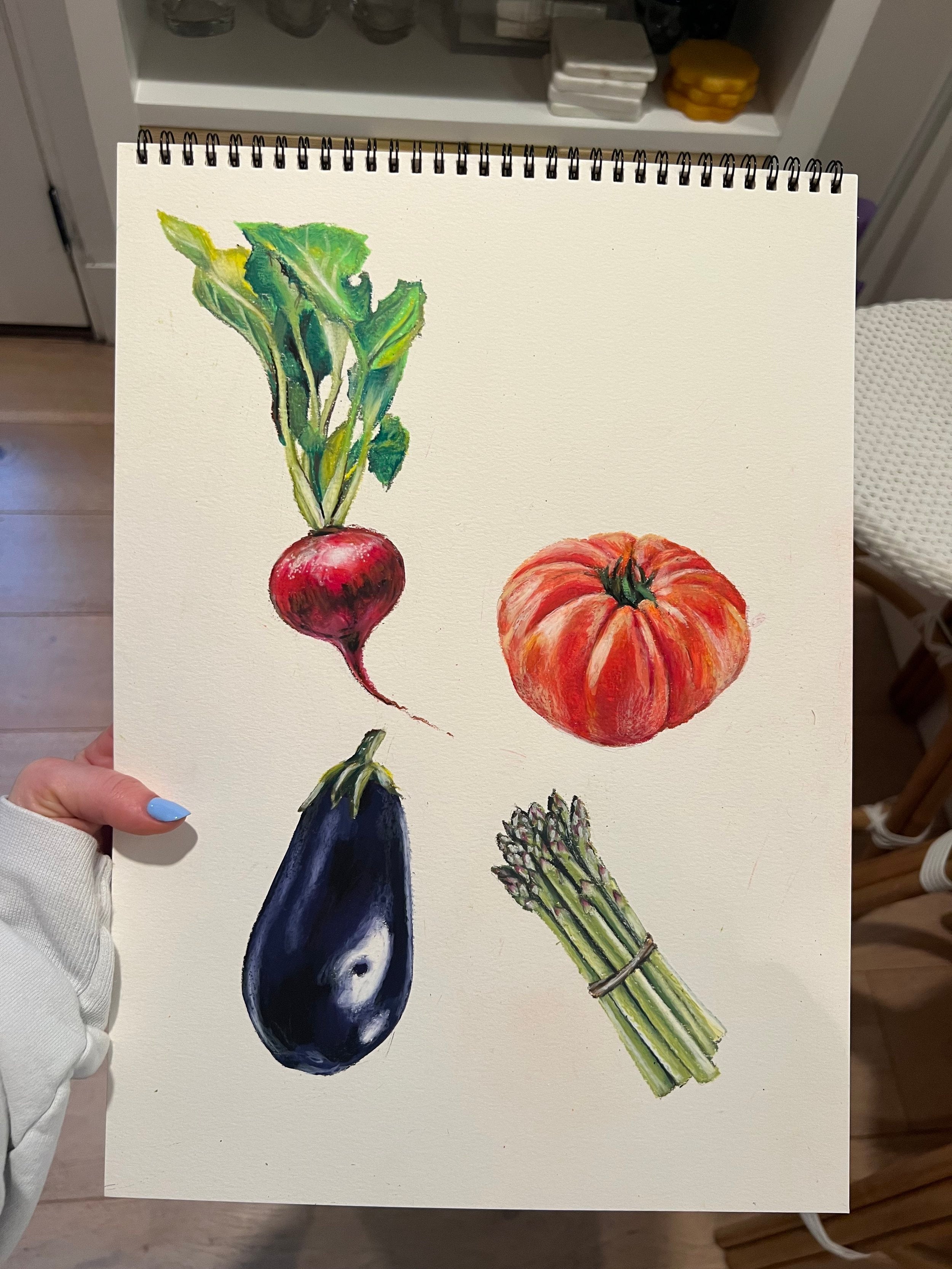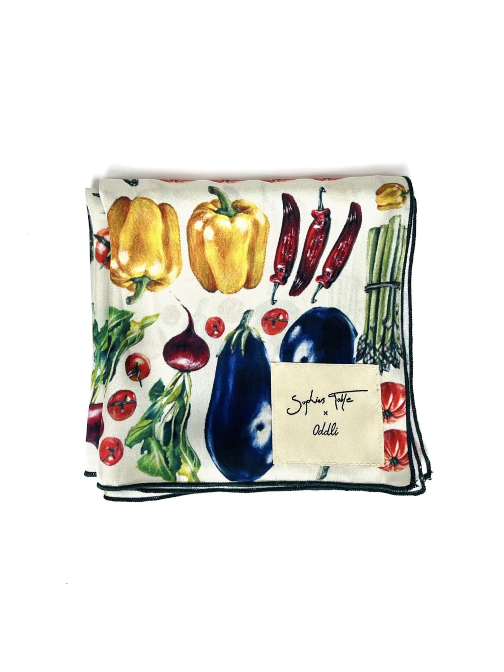 My illustrations on paper, before being scanned and adapted into the final scarf design. Because Sophie’s Table is a cooking platform, Oddli requested that I illustrate each one of these specific vegetables. The illustrations were done using water-soluble wax pastels.